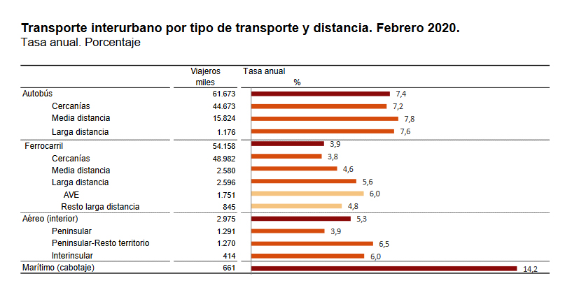 Los datos provisionales publicados por el Instituto Nacional de Estadística revelan que el número de viajeros del transporte público durante el pasado mes de febrero aumentó un 5,1 por ciento respecto al mismo mes de 2019. En cuanto al número global de usuarios del ferrocarril, registró un incremento del 3,9 por ciento durante dicho mes con respecto a la demanda registrada en febrero del año anterior.