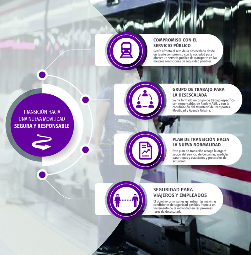 En este contexto, se ha constituido un grupo de trabajo específico formado por responsables de Renfe y Adif, con la coordinación del Ministerio de Transportes, Movilidad y Agenda Urbana, que está trabajando en un Plan de Transición para una nueva normalidad en los servicios ferroviarios ante la desescalada.