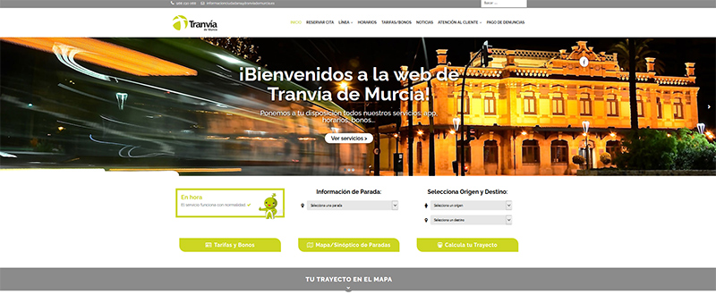 Además, se incluye una sección para calcular los trayectos; un acceso directo a las redes sociales corporativas desde la propia web; un servicio de cita previa para realizar gestiones en la Oficina de Información Ciudadana; servicio de chat para realizar consultas en tiempo real; un formulario de contacto para enviar consultas al departamento de Información Ciudadana y la posibilidad de pagar denuncias a través de la web mediante tarjeta de crédito o Pay Pal, evitando así el desplazamiento de los usuarios a las oficinas de Transporte de Murcia.