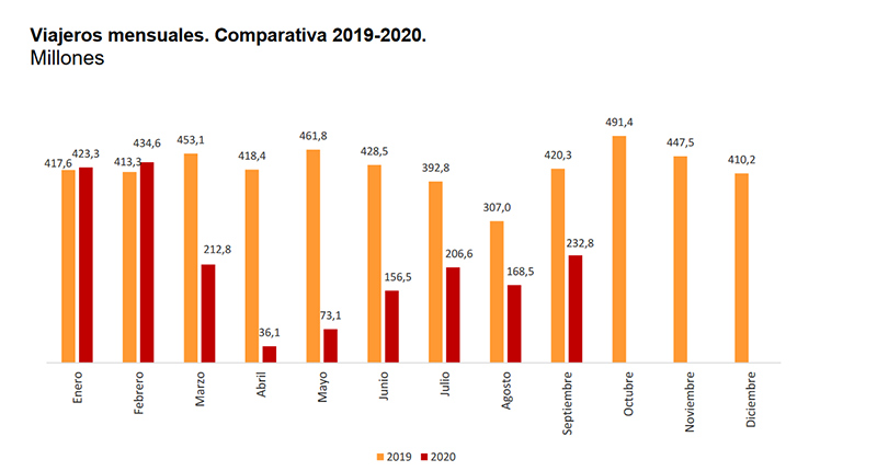 El pasado mes de septiembre, más de 232,8 millones de personas utilizaron el transporte público, frente a los 420,3 millones registrados en el mismo mes de 2019. En los primeros nueve meses de 2020 el número de viajeros se ha reducido casi a la mitad ─concretamente un 47,6 por ciento─ respecto al mismo periodo del año pasado.