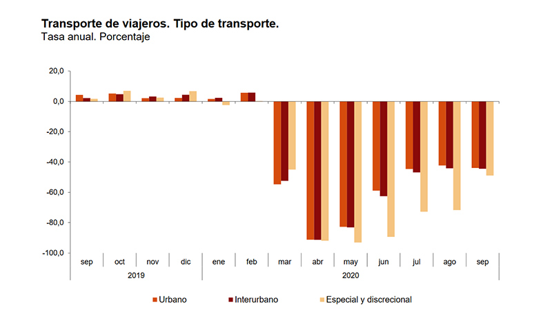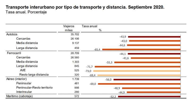Los datos provisionales publicados por el Instituto Nacional de Estadística revelan que el número de viajeros del transporte público durante el pasado mes de septiembre decreció un 44,6 por ciento respecto al mismo mes de 2019, con motivo de la disminución de la movilidad derivada de la crisis sanitaria del coronavirus. Dicho descenso de la demanda afecta a todos los modos de transporte y, en el caso del ferrocarril, fue del 44,1 por ciento en el noveno mes del año.