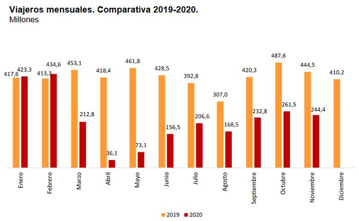 En los once primeros meses de 2020 el número de viajeros se redujo casi a la mitad ─concretamente un 47,2 por ciento─ respecto al mismo periodo del año pasado.