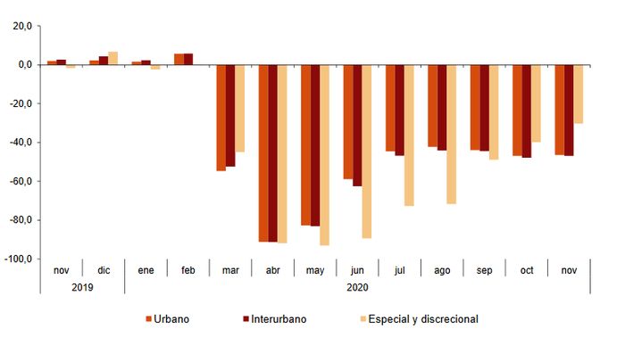Más de 63,7 millones de viajeros utilizaron el transporte interurbano en noviembre, lo que supone un descenso del 47,5 por ciento respecto al mismo mes del año anterior.