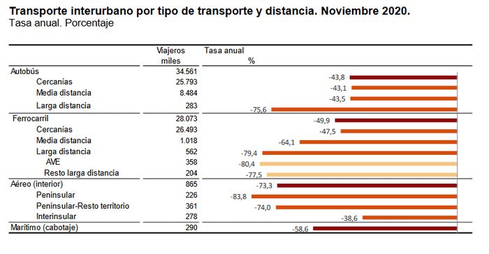 Los datos provisionales publicados por el Instituto Nacional de Estadística revelan que el número de viajeros del transporte público durante el pasado mes de noviembre decreció un 45 por ciento respecto al mismo mes de 2019, con motivo de la disminución de la movilidad derivada de la crisis sanitaria del coronavirus. Dicho descenso de la demanda afecta a todos los modos de transporte y, en el caso del ferrocarril, fue del 49,9 por ciento en dicho mes.