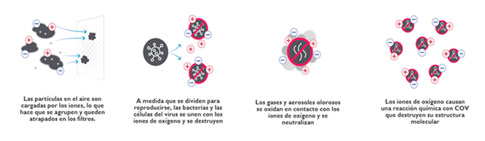 Técnicamente, la ionización consiste en aplicar un campo eléctrico al aire de modo que se generen iones positivos y negativos que atacan la membrana del virus dejando expuesto su ARN a la oxidación e inactivándolo.