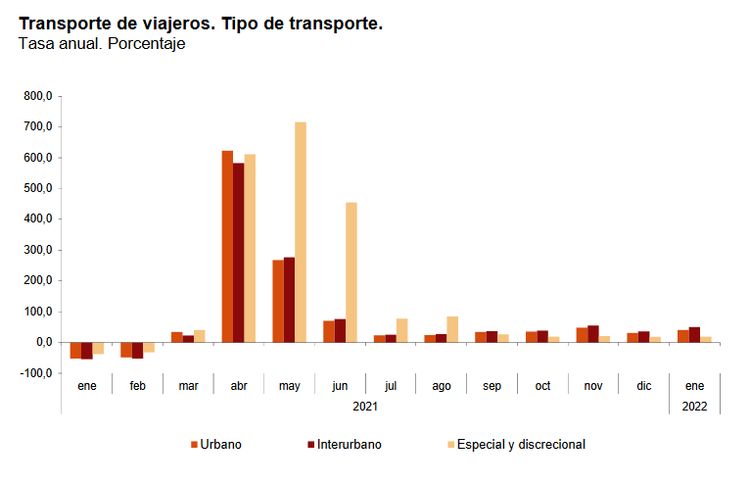 En cuanto al transporte urbano en autobús, aumentó un 43,1 por ciento en enero respecto al mismo mes de 2021, con tasas anuales positivas en todas las comunidades autónomas.