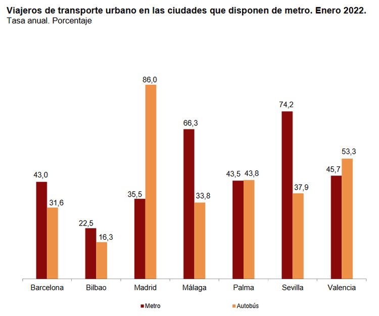 El transporte en metro creció en enero un 37,7 por ciento en tasa anual, con un total de 75.017.000 viajeros transportados e incrementos en las siete ciudades que disponen de este modo de transporte. El metro de Sevilla fue el que registró un mayor incremento de la demanda, con un 74,2 por ciento más de viajeros que en el mismo mes de 2021, seguido del metro de Málaga, con un 66,3 por ciento más. A continuación se situaron los metros de Valencia, con un crecimiento de la demanda del 45,7 por ciento, Palma (+ 43,5), Barcelona (43), Madrid (35,5) y Bilbao, con un incremento de usuarios del 22,5 por ciento.
