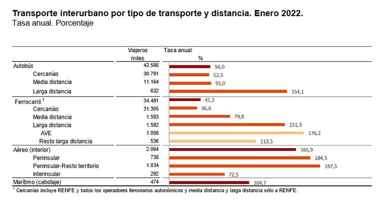 Los datos provisionales publicados por el Instituto Nacional de Estadística revelan que el número de viajeros del transporte público durante el pasado mes de enero aumentó un 40,4 por ciento respecto al mismo mes de 2021. En lo que respecta al transporte por ferrocarril, la demanda creció un 42,2 por ciento en el primer mes del año, si bien se disparó hasta el 176,2 por ciento en el caso del AVE.