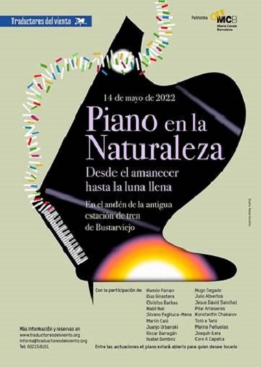 Por primera vez, decenas de pianistas se reúnen en la naturaleza para ver salir y ponerse el sol en compañía de la música. El acto será en la Estación de tren de Bustarviejo, en Madrid, el sábado 14 de mayo, de 07:10 de la mañana a 23:00h.