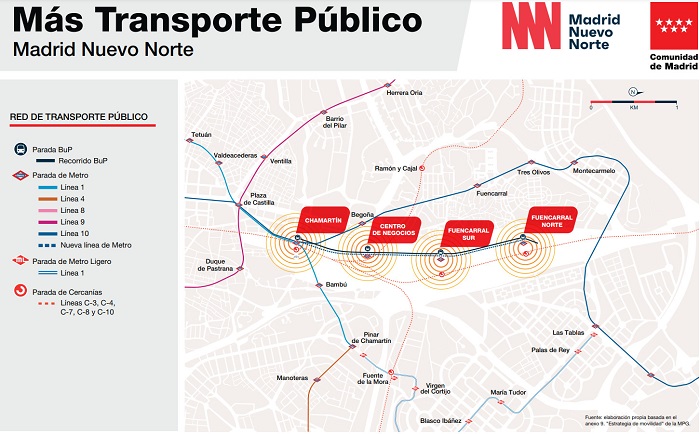 La Comunidad de Madrid y Distrito Castellana Norte han firmado un convenio para iniciar las actuaciones previas para la construcción de la nueva línea de Metro que recorrerá el desarrollo urbanístico Madrid Nuevo Norte. Esta nueva infraestructura de transporte público ampliará y reorganizarán la oferta en esta zona de la capital. La futura línea, de tres kilómetros de longitud, empezará su recorrido en la actual estación de Chamartín y tendrá tres nuevas estaciones: Centro de Negocios, Fuencarral Sur y Fuencarral Norte. Una vez operativa, se estima que tendrá una demanda potencial de 40.000 viajeros diarios.