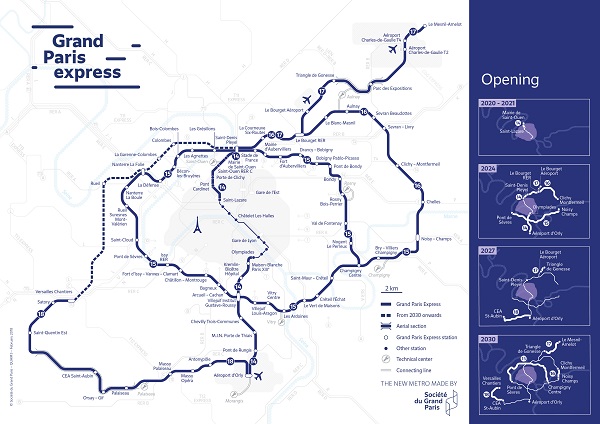 Grand Paris Express es una obra de infraestructuras que duplicará la red actual y contempla la construcción y puesta en servicio de doscientos kilómetros de líneas de circunvalación en la región parisina. El objetivo es que conecten con las líneas de metros radiales ya existentes para acerca la periferia y el centro y mejorar la movilidad. Esta iniciativa incluye cuatro nuevas líneas alrededor de la capital, el 90 por ciento subterráneas, así como la ampliación de dos líneas fuera de París, la 11 y la 14, además de 68 nuevas estaciones.