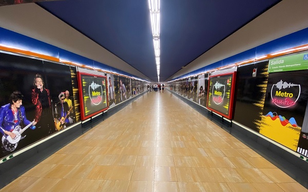 La muestra que decora esta parada, junto al estadio Wanda Metropolitano del Atlético de Madrid, la componen más de sesenta imágenes, desde Raphael a los Rolling Stones, Maluma, Madonna, Los Secretos, Sabina o Alejandro Sanz.