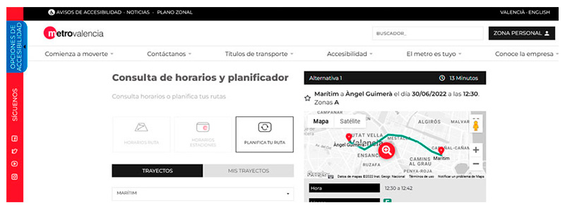 Metrovalencia ha diseñado una web con mejoras en la solicitud de las tarjetas personalizadas con elección de lugar de recogida y pago online. Destaca su módulo de cálculo de trayectos y los accesos directos a algunas de las opciones personalizadas que están disponibles.