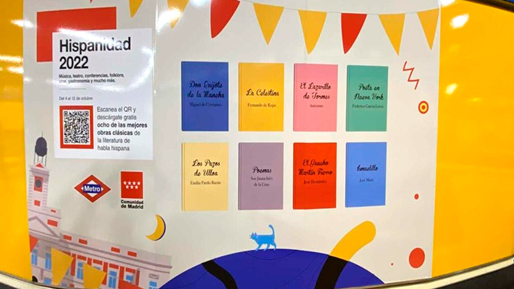 Durante el mes de octubre, para celebrar el día de la Hispanidad, Metro de Madrid ofrecerá a los viajeros la descarga gratuita de ocho libros clásicos de la literatura en español. Además, se entregan tarjeteros conmemorativos de esta festividad en las tiendas de las estaciones de de Plaza de Castilla y Sol.