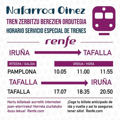 Renfe pondrá en circulación una serie de trenes especiales de Media Distancia para facilitar el desplazamiento a las fiestas de Nafarroa Oinez en Tafalla. Este dispositivo de transporte supone una oferta de 4.800 plazas de programación especial. El operativo de refuerzo habilitará trenes desde Pamplona a las 9:21, 10:05, 11:00 y 11:55. También habrá un tren especial desde Cortes de Navarra a las 8:02 para llevar a los viajeros de la Ribera al recinto festivo.