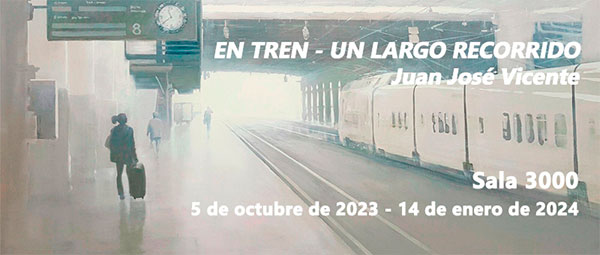 La Sala 3000 del Museo del Ferrocarril de Madrid acoge, del 5 de octubre de 2023 al 14 de enero de 2024, la exposición “En tren-Un largo recorrido”, de Juan José Vicente. Esta muestra permite comparar su trayectoria artística con los viajes ferroviarios que llevan inspirándole durante años. En esta obra se vale de soportes de madera y de una pintura acrílica con una extensa gama de grises, para trasladarnos a la época del vapor y del hierro fundido.