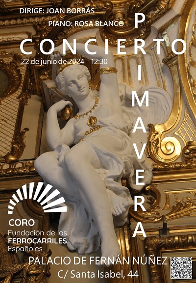El Coro de la Fundación de los Ferrocarriles Españoles ofrecerá su Concierto de Primavera en el Palacio de Fernán Núñez el sábado 22 de junio, a las 12:30 horas. En esta actuación interpretará "Habanera Don Gil de Alcalá", "Alma llanera", "Bésame mucho", "A tu lado", "Carnevale di Venezia" o "Blancas como palomas", entre otras piezas.