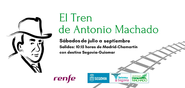El pasado 6 de julio, el Tren de Antonio Machado inició su temporada para descubrir la huella del poeta en Segovia. Este tren temático de Renfe, que circula entre Madrid y Segovia, ofrece cada sábado de julio, agosto y septiembre un viaje de contenido cultural y gastronómico que incluye el desplazamiento de ida y vuelta, visitas guiadas y la tarjeta turística Amigos de Segovia con la que se obtienen descuentos en hoteles, restaurantes, comercios y artesanía.