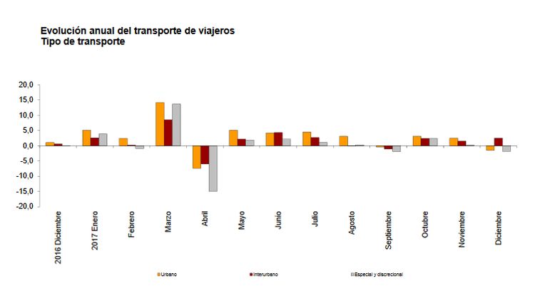 Según los datos que avanza el INE, el transporte urbano se incrementó un 2,8 por ciento en 2017 y el interurbano un 1,6. Dentro del transporte urbano, el transporte en metro creció un 4,8 por ciento, mientras que en autobús lo hizo en un porcentaje del 1,6 con respecto al ejercicio anterior.