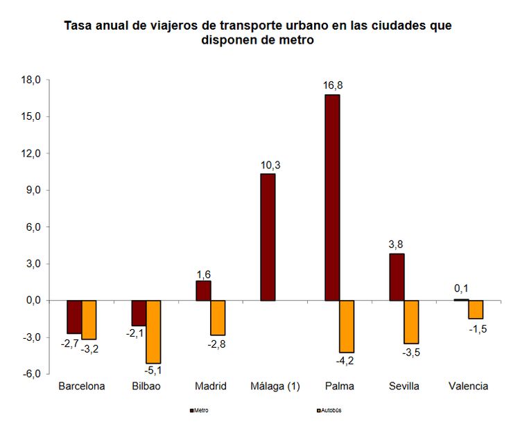 En cuanto al transporte metropolitano, el número de usuarios no varía con respecto a diciembre de 2016. El metro de Palma presenta el mayor crecimiento, con un 16,8 por ciento, y el de Barcelona la mayor bajada (–2,7 por ciento). Del resto de ciudades que cuentan con este modo de transporte, todas registraron tasas positivas –Málaga, con un aumento del 10,3 por ciento, Sevilla (+ 3,8), Madrid (+1,6), y Valencia (+0,1)–, salvo Bilbao, cuya demanda descendió en diciembre en un porcentaje del 2,1.