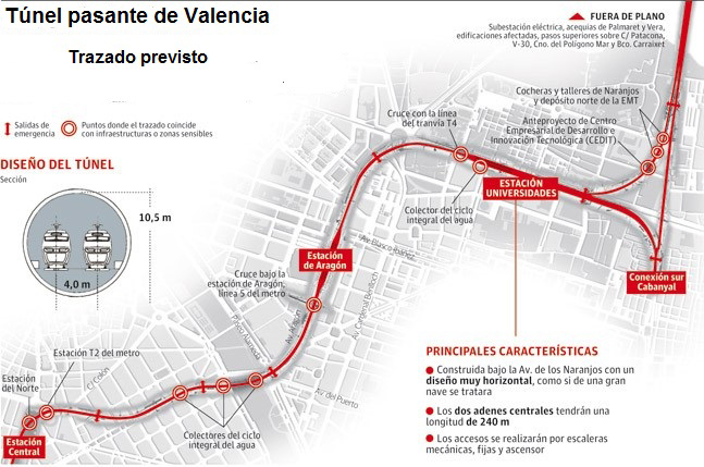 El túnel conectará por el sur con la futura estación de Valencia, actuación enmarcada en la operación de remodelación de la Red Arterial Ferroviaria de Valencia, por lo que ambas actuaciones deben coordinarse.
