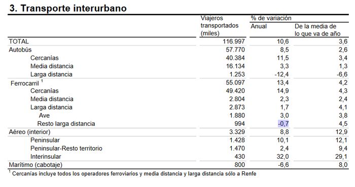 De ellos, 55.097.000 utilizaron el ferrocarril para sus desplazamientos –49.420.000 usuarios viajaron en los trenes de cercanías, 2.804.000 en los de media distancia y 2.873.000 lo hicieron en los de larga distancia. De estos últimos, 1.880.000 viajaron en AVE y 994.000 en el resto de trenes de larga distancia. Estas cifras suponen un aumento del 13,4 por ciento del número global de viajeros en ferrocarril en dicho mes, con respecto a los datos registrados en abril del año anterior.