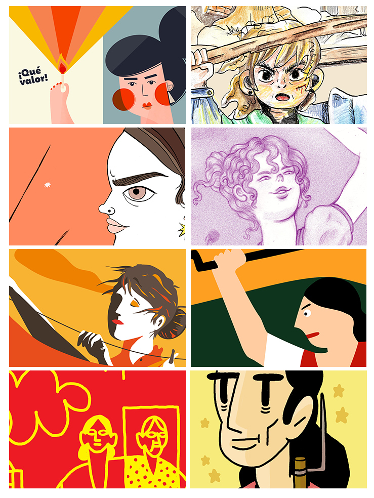 Por su parte, las ilustraciones del zaragozano Maiky Maik representan a Manuela Sancho o a Agustina de Aragón mientras la diseñadora gráfica e ilustradora Laura Izquierdo representa la valentía que demostró Agustina de Aragón para evitar el asedio de las tropas francesas.