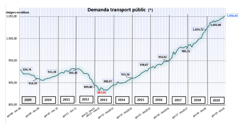 Además, durante 2019 se superaron también el récord absoluto de viajeros en un día laborable, el 14 de octubre, en que se frotaron los 1,5 millones, y el récord semanal, del 21 al 27 de octubre, en el que se registraron 8,8 millones de viajes.