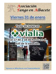 La estación de Adif vialia Albacete Los Llanos acoge hoy, a partir de las 17.30 horas, una exhibición de baile en la modalidad de tango argentino, En el vestíbulo principal de la estación,, bailarán miembros de la Asociación Tango en Albacete, un grupo dedicado a la difusión, aprendizaje, disfrute y dinamización del tango que está dándose a conocer con actuaciones en diferentes espacios públicos.