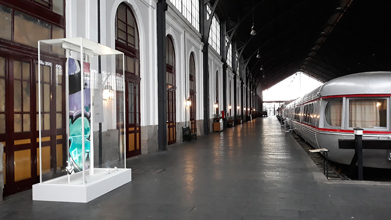 La puerta grafiteada de un tren de Cercanías, expuesta en la feria de Arte Contemporáneo Arco 2019, ha terminado su recorrido y ha quedado instalada, protegida por una urna transparente, en el Museo del Ferrocarril de Madrid.