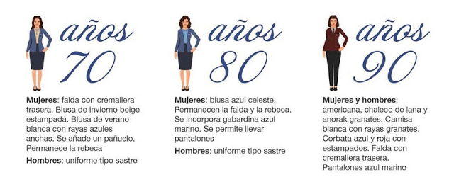 A partir de los 70, el uniforme evoluciona al traje tipo sastre, en el caso de los hombres, y a la falda con blusa y chaqueta, en el caso de las mujeres, a lo que se incorporó una gabardina como prenda de abrigo en los años 80. En esa década también se introduce el uso de pantalón entre el personal femenino.