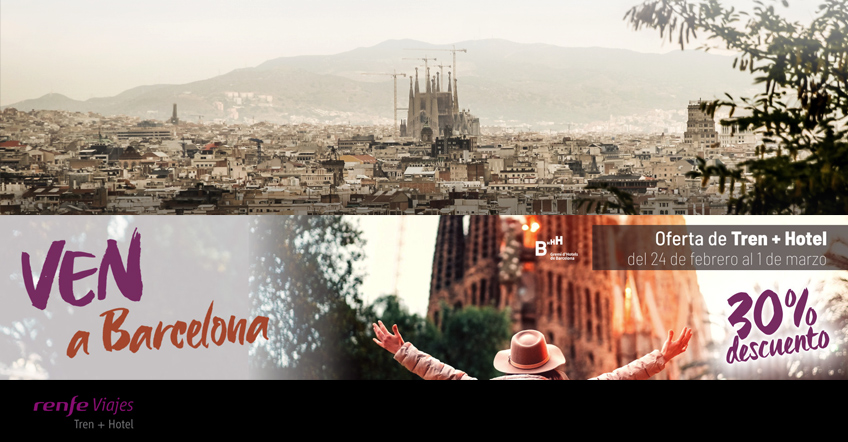 La oferta “Promo Barcelona” podrá adquirirse en la sección Renfe Viajes de la web de Renfe y estará disponible entre los días 24 de febrero y el 1 de marzo.