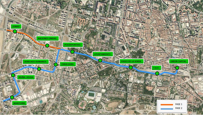 La ejecución de la extensión de la línea tranviaria se realizará en dos fases diferenciadas: la fase 1 que corresponde a Green Capital - Mariturri, con una longitud aproximada de 4.800 metros, y la fase 2, relativa al ramal de Júndiz, aproximadamente de 1.200 metros.