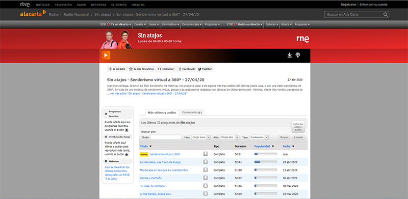 El programa Sin Atajos de Radio Nacional de España, el 25 y 27 de abril, recibió a la responsable de Vías Verdes de la Fundación de los Ferrocarriles Españoles para hablar de las vías verdes “virtuales” y el efecto de la crisis actual sobre estos itinerarios.