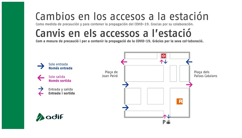 Desde el 1 de mayo, la entrada de viajeros a la estación por la fachada del lado Plaça dels Països Catalans se realiza única y exclusivamente por el núcleo lateral de puertas (lado Sants), mientras que el núcleo central concentra las salidas.