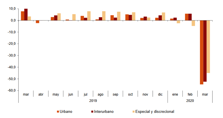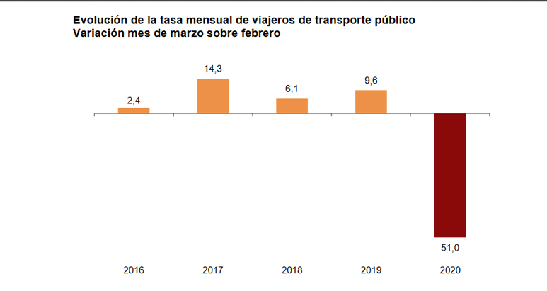 En lo que respecta al transporte urbano en autobús, el número global de viajeros disminuyó un 54,1 por ciento respecto a marzo de 2019.
