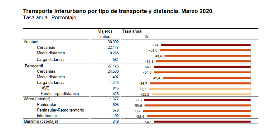 Dentro de éste, el transporte por ferrocarril registró en dicho mes un descenso global del 54,1 por ciento, con desplomes en la demanda en todos los tipos de servicios.
