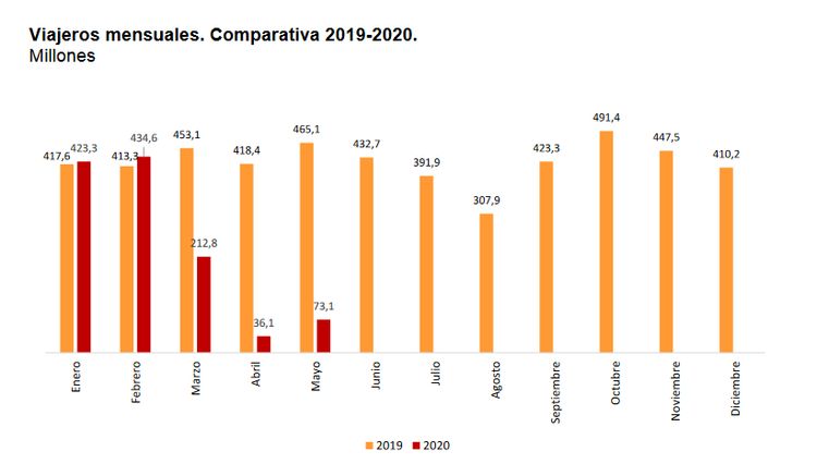 En los servicios de larga distancia, el transporte más afectado sigue siendo el aéreo, con un descenso anual del 97,8 por ciento —apenas 80.000 pasajeros utilizaron este medio en mayo.