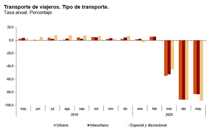 El transporte urbano fue utilizado por más de 48 millones de viajeros en mayo, un 82,8 por ciento menos que en el mismo mes del año 2019. El transporte en metro disminuyó un 82,2 por ciento en tasa anual, siendo el metro de Palma el que presentó el mayor descenso, con un 91,4 por ciento menos de viajeros que en mayo de 2019.
