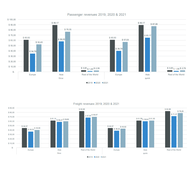 En este marco general, a pesar de la profunda recesión y de la pérdida de la confianza del viajero, se espera que los paquetes de ayuda de los gobiernos que incluyen la protección del medio ambiente, ayuden a atraer la demanda de pasajeros en 2021, en porcentajes diferentes dependiendo de cada país y de acuerdo con su capacidad de reanudación de la actividad. En estas condiciones, se espera que la demanda de viajeros disminuya en 2021 en un promedio de hasta el 4 por ciento en comparación con 2019, y en un 3 por ciento en el sector de mercancías.
