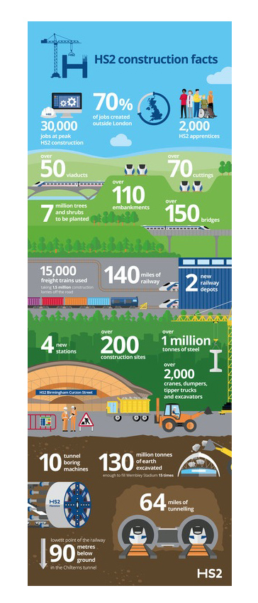 La Fase 1 de la construcción del proyecto High Speed 2, HS2, de 225 kilómetros desde Londres hasta Birmingham y Lichfield, ya está en marcha. En esta fase, el trazado atravesará más de cincuenta kilómetros de túneles y discurrirá sobre más de dieciséis kilómetros de viaductos.