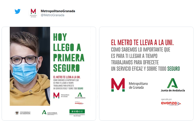 (06/10/2020) La campaña, cuyo lema es “Hoy llego a primera seguro”, juega con el doble sentido de la seguridad. Por un lado, los estudiantes consideran importante llegar a tiempo a clase, por lo que el metro les ofrece un servicio eficaz y puntual, sin atascos y cómodo para llegar a tiempo a primera hora. Por otro, la seguridad frente al contagio se garantiza con las medidas establecidas por el Metro de Granada frente al Covid-19, medidas que están certificadas por Aenor, que lo reconoce como un medio de transporte seguro.