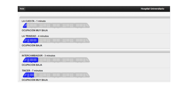 Cada usuario que acceda a la aplicación, deberá elegir la parada que quiere consultar, apareciéndole en pantalla el tiempo que falta para la llegada de los próximos tranvías, así como el nivel de ocupación de pasajeros que presenta cada tranvía en cada momento.