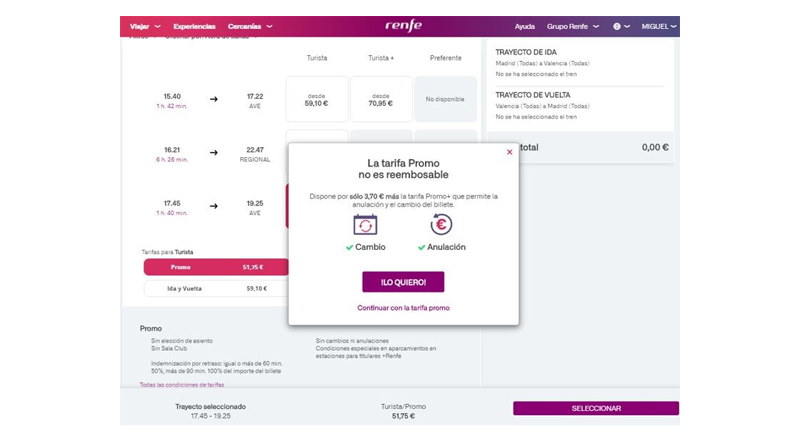 Así, ahora se muestran todas las clases disponibles en cada tren y el precio más barato de cada una. Al clicar sobre una clase se despliegan todas las tarifas disponibles (promo, promo+, flexible, etc.), y al seleccionar clase y tarifa se muestra con claridad cuáles son sus atributos (como elección de asiento, cambios, etc.).