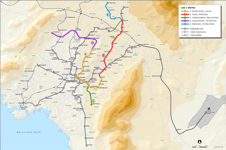 El primer tramo, incluido en la primera fase del proyecto, Goudi-Alsos Veiko, tiene una longitud de 12,8 kilómetros y quince estaciones. La primera fase se ha diseñado para dar servicio a varias áreas densamente pobladas del Ática y el centro de Atenas, mediante la construcción de cuatro nuevas estaciones: Exarchia, Academia, Kolonaki y Evangelismos.