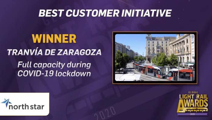 El Tranvía de Zaragoza ha ganado el premio “Best Customer Initiative”, Mejor Iniciativa para el Cliente, en la gala de los Global Light Rail Awards 2020, celebrada en Londres y retransmitida a través de internet. El galardón reconoce las acciones desarrolladas en el transporte público desde el área de Servicios Públicos y Movilidad del Ayuntamiento de Zaragoza para hacer frente al Covid-19.