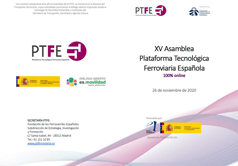 El jueves 26 de noviembre la Plataforma Tecnológica Ferroviaria Española (PTFE), cuya Gerencia y Secretaría Técnica se desarrollan desde la Fundación de los Ferrocarriles Españoles, celebrará su decimoquinta asamblea anual, este año, ante la situación sanitaria en formato virtual