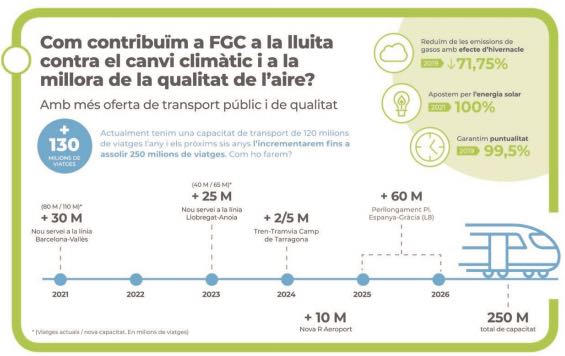 FGC tiene en marcha diversas actuaciones destinadas a duplicar su actual oferta de transporte público, como medida contra el cambio climático y la contaminación atmosférica y como contribución hacia una movilidad más sostenible. Estas actuaciones permitirán incrementar la capacidad actual de transporte de la compañía de los 120 millones de viajes al año hasta los más de 250, fomentando un cambio modal y la transferencia de usuarios del vehículo privado hacia el transporte público colectivo.