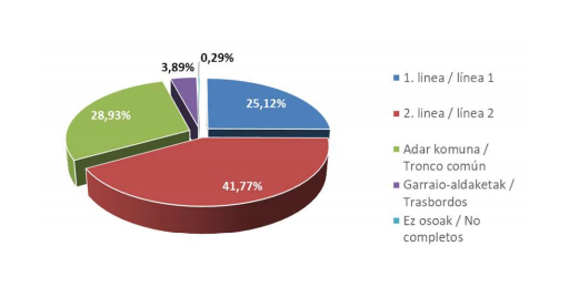 Respecto a las estaciones más utilizadas de la red, Casco Viejo, Indautxu, Moyua y San Mamés, se mantienen en los primeros puestos pero también con un menor número registrado de viajes. Y en cuanto a los desplazamientos se mantienen prácticamente los datos porcentuales de cada línea sobre el total de viajes, con un ligero aumento de los desplazamientos en la línea 2 y descenso del tronco común.