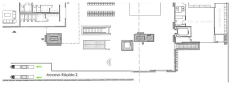 Tras estudiar varias alternativas, se ha optado por abrir dos nuevos accesos a la sala de embarque para incrementar el número de escáneres, uno de ellos en el pasillo lateral lado montaña (frente a la comisaría de los Mossos d’Esquadra), y otro en el lado mar (junto a la oficina de información al cliente). En ambos accesos se instalarán dos escáneres de acceso rápido, manteniendo las distancias de evacuación y los anchos mínimos de los pasillos.